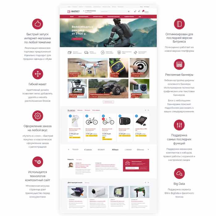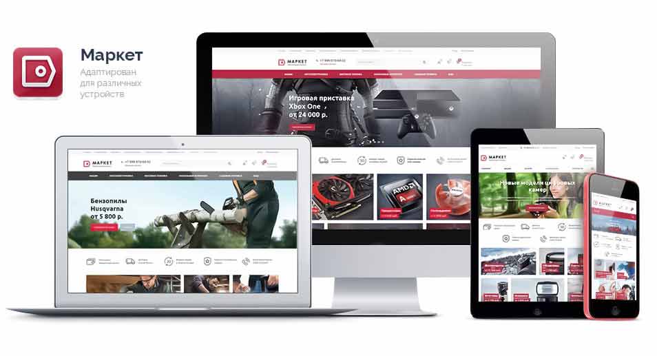 Маркет - универсальный интернет-магазин для розничной продажи любых видов товаров. Решение прекрасно адаптировано для продажи одежды, электроники, бытовой техники, стройматериалов, детских товаров, оборудования, продуктов питания и т.д.