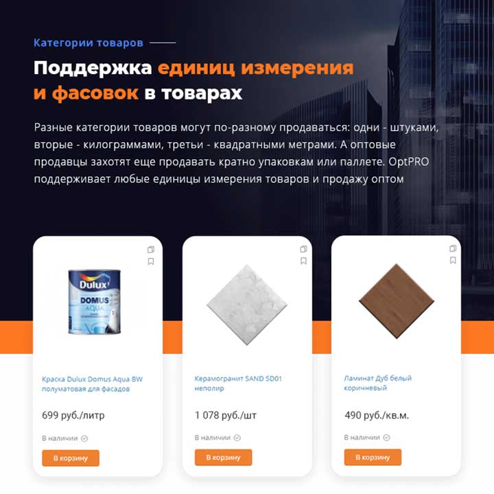 Разные категории товаров могут продаваться по-разному: одни-штуками, вторые-килограммами, третьи- квадратными метрами. А оптовым продавцам еще нужно продавать кратно упаковкам или паллетам. OptPRO поддерживает любые единицы измерения товаров и продажу оптом.