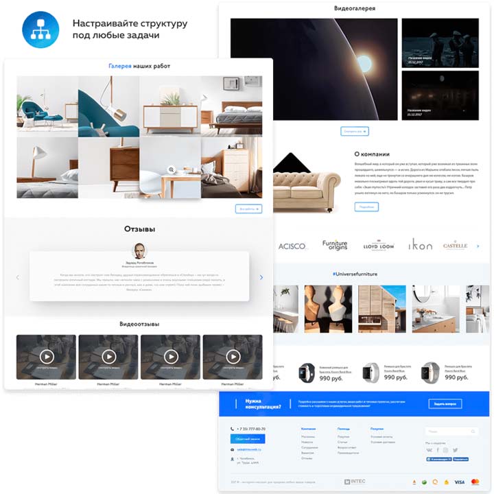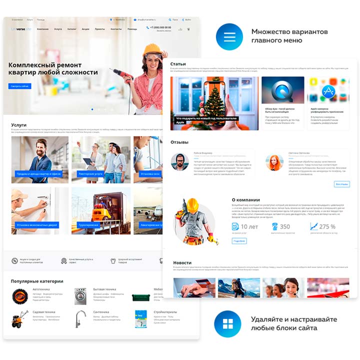 Благодаря уникальному конструктору дизайна Universe вы сможете адаптировать сайт под индивидуальные задачи вашего бизнеса легко и просто без правки HTML-кода. Вы просто добавляете необходимые блоки и модули - отзывы, лид-формы, баннеры и разделы каталога и перетаскиваете их по странице в нужное место.