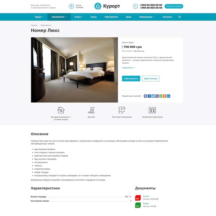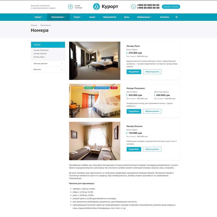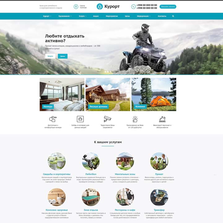 Курорт — это профессиональное решение для создания сайта отеля, базы отдыха, санатория или курорта. Готов к запуску прямо «из коробки»: после установки и первичной настройки сайта останется лишь рассказать о компании и разместить основную информацию о вариантах проживания и дополнительных услугах.