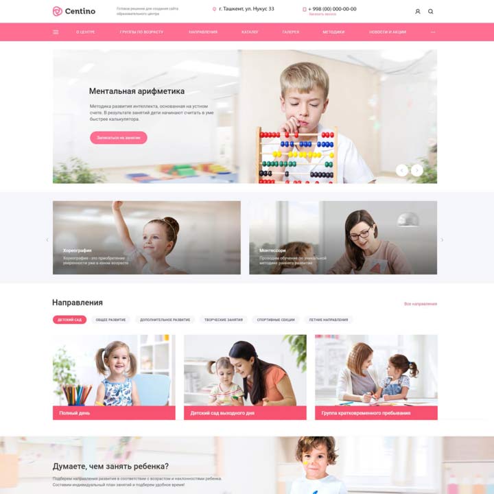 Детский сад и образовательный центр — корпоративный сайт для детских образовательных организаций. Подойдет центрам дополнительного и общего развития, детским садам, творческим и спортивным секциям. Структура, контент и функционал сайта разработаны с учетом специфики бизнеса в сфере образования. В решении созданы направления по возрастам, добавлено расписание, фотогалерея и запись на пробное занятие.