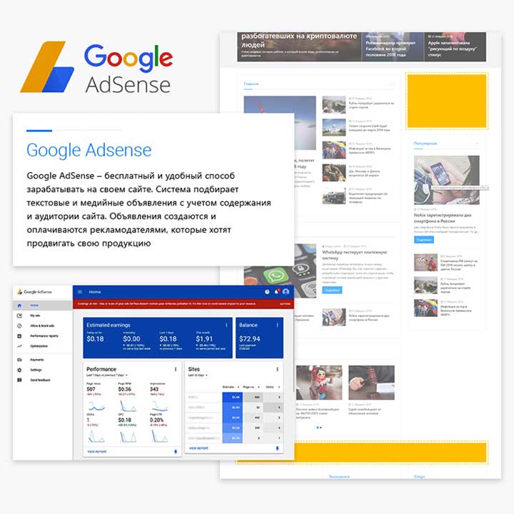 Новостной сайт интегрируется с Google AdSense – бесплатный и удобный способ зарабатывать на своем сайте. Система подбирает текстовые и медийные объявления с учетом содержания и аудитории сайта. Объявления создаются и оплачиваются рекламодателями, которые хотят продвигать свою продукцию.